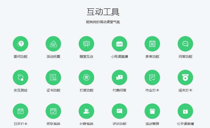 完善的教学功能,不仅适用于1对1,1对多等各种班型,支持直播、录播、点播等各种形式,且软件内嵌丰富的教学工具和实用的互动工具,签到、答题、学生学习情况追踪等个性化功能,充分满足了在线老师和学生的所有需求。